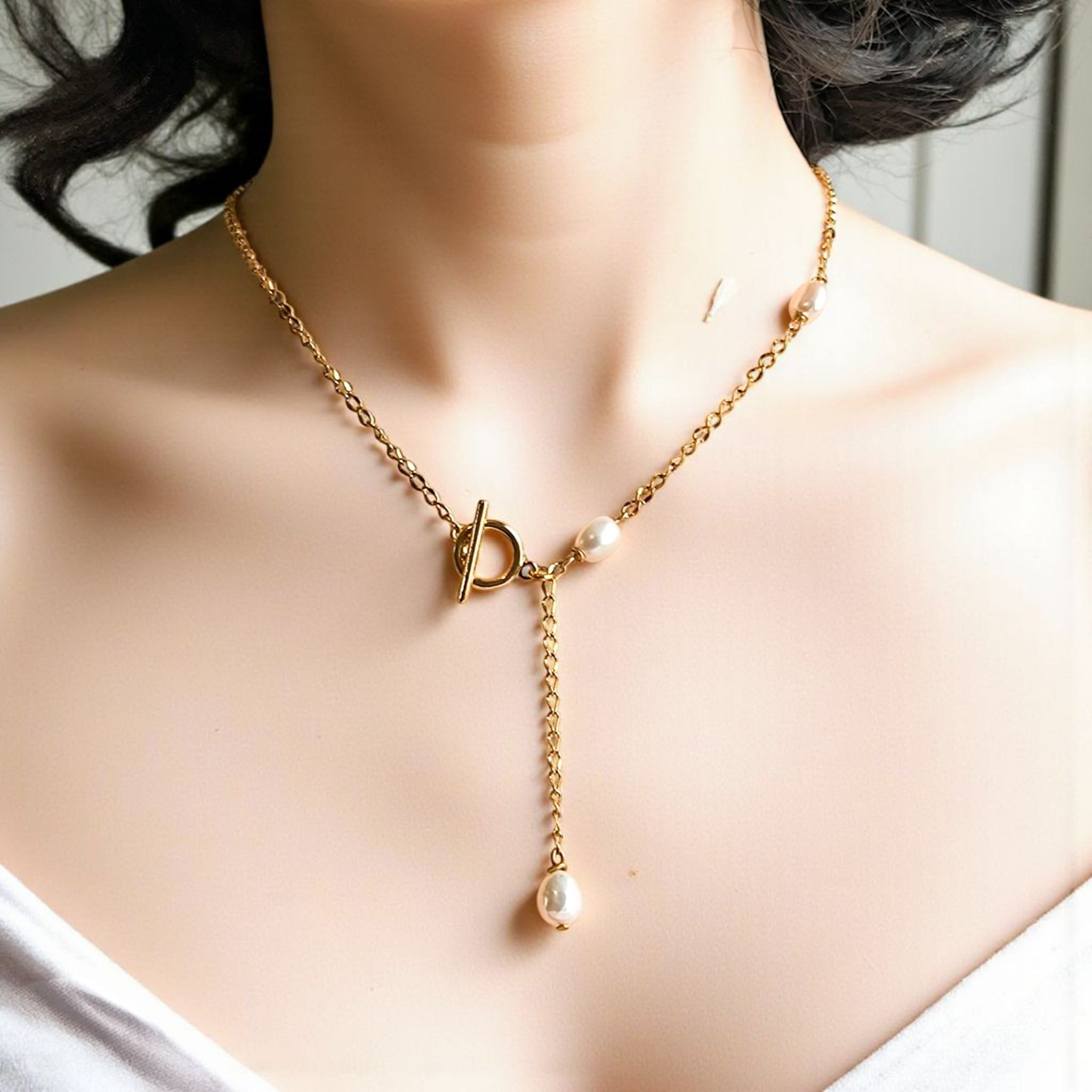 Un collier raffiné qui marie la modernité de l’acier inoxydable doré à la délicatesse intemporelle des perles d’eau douce.