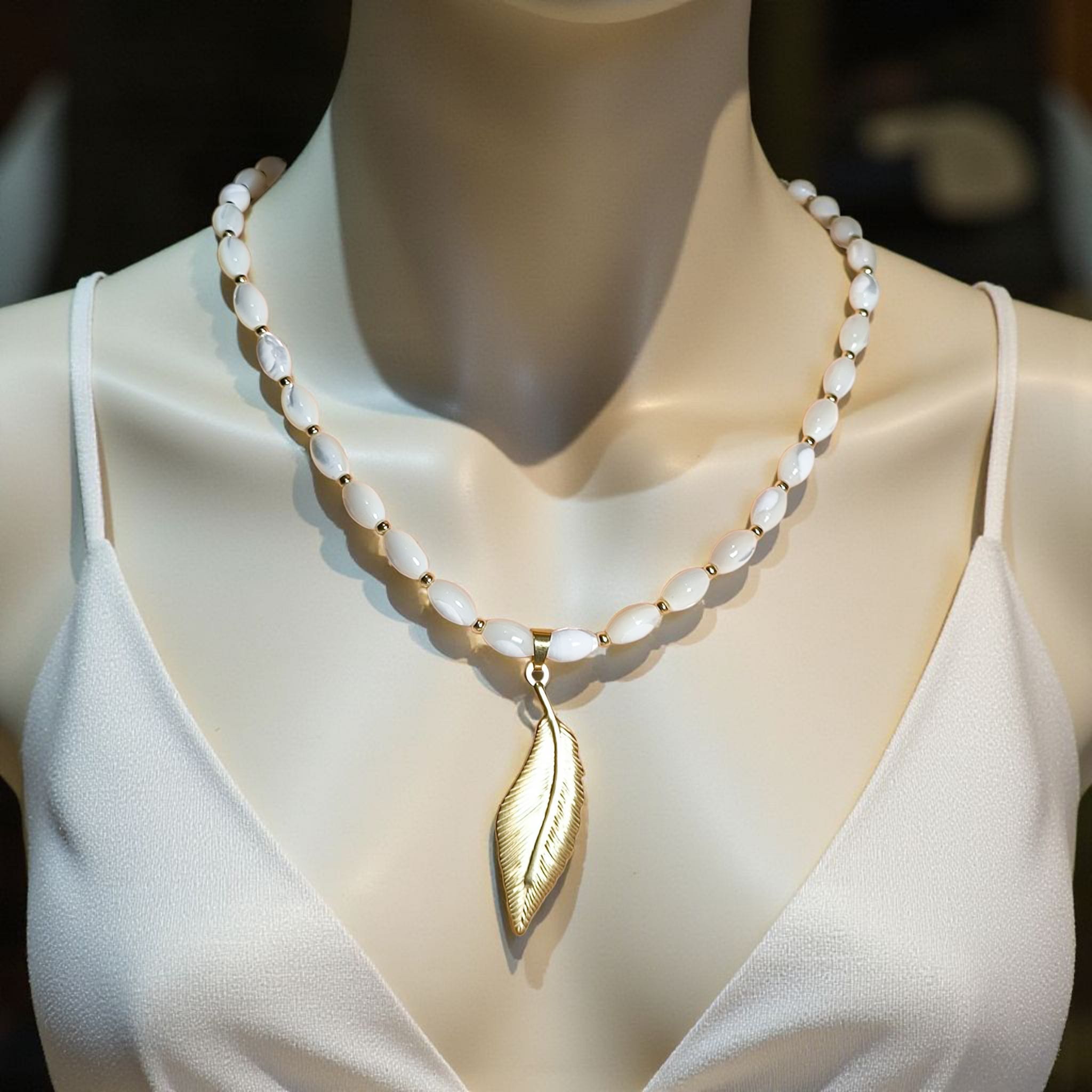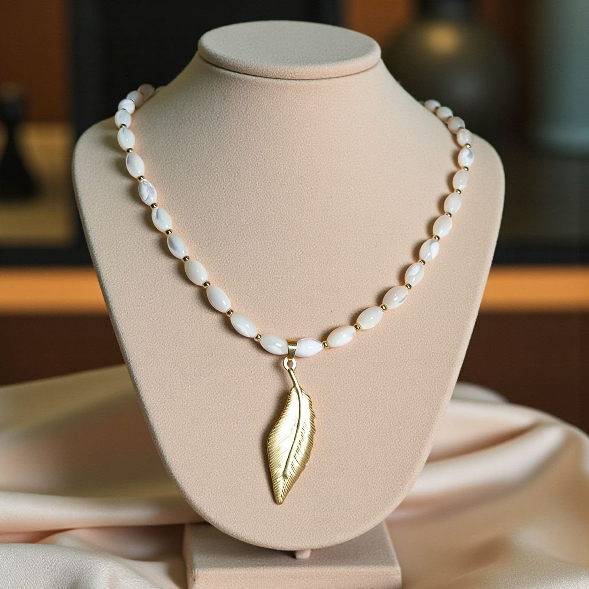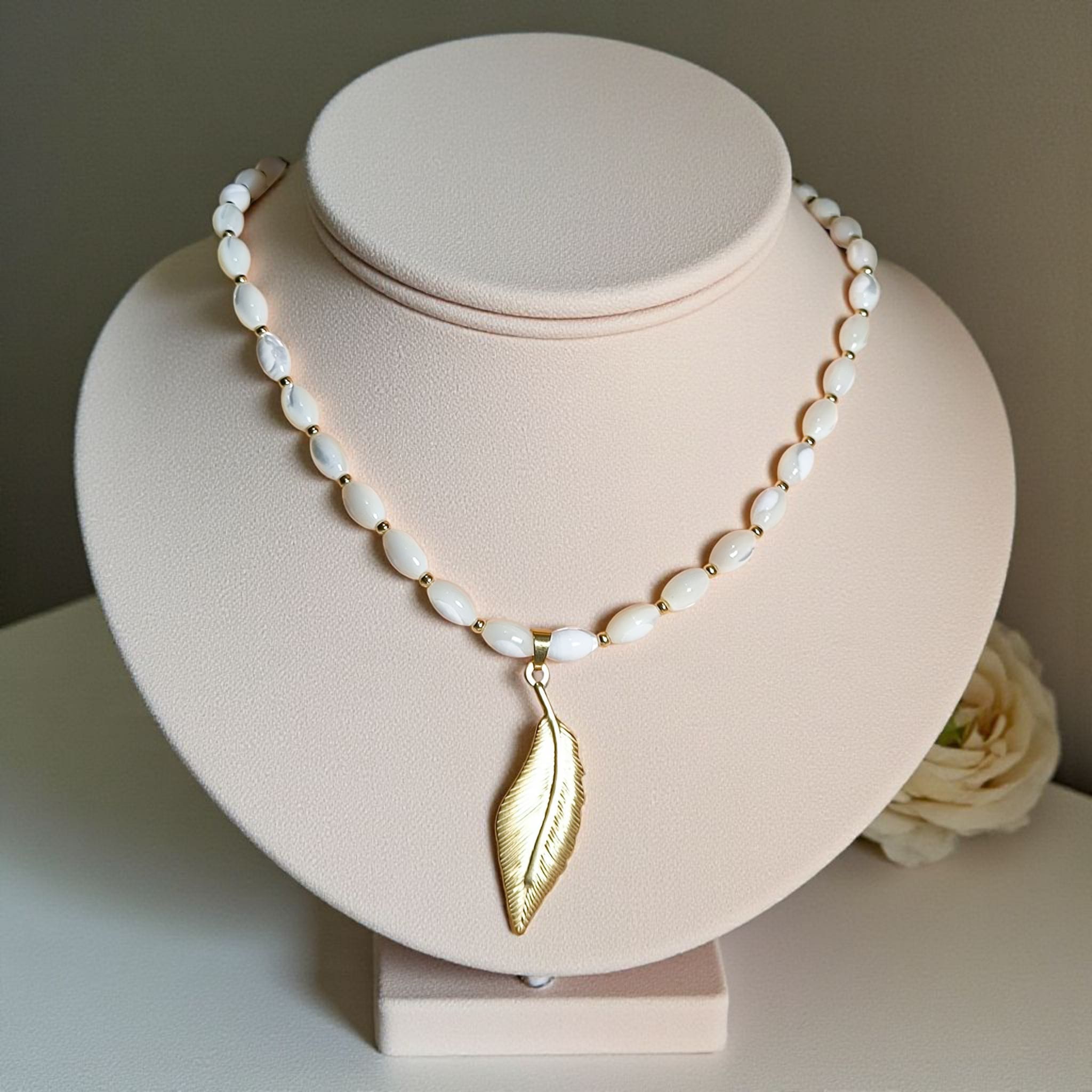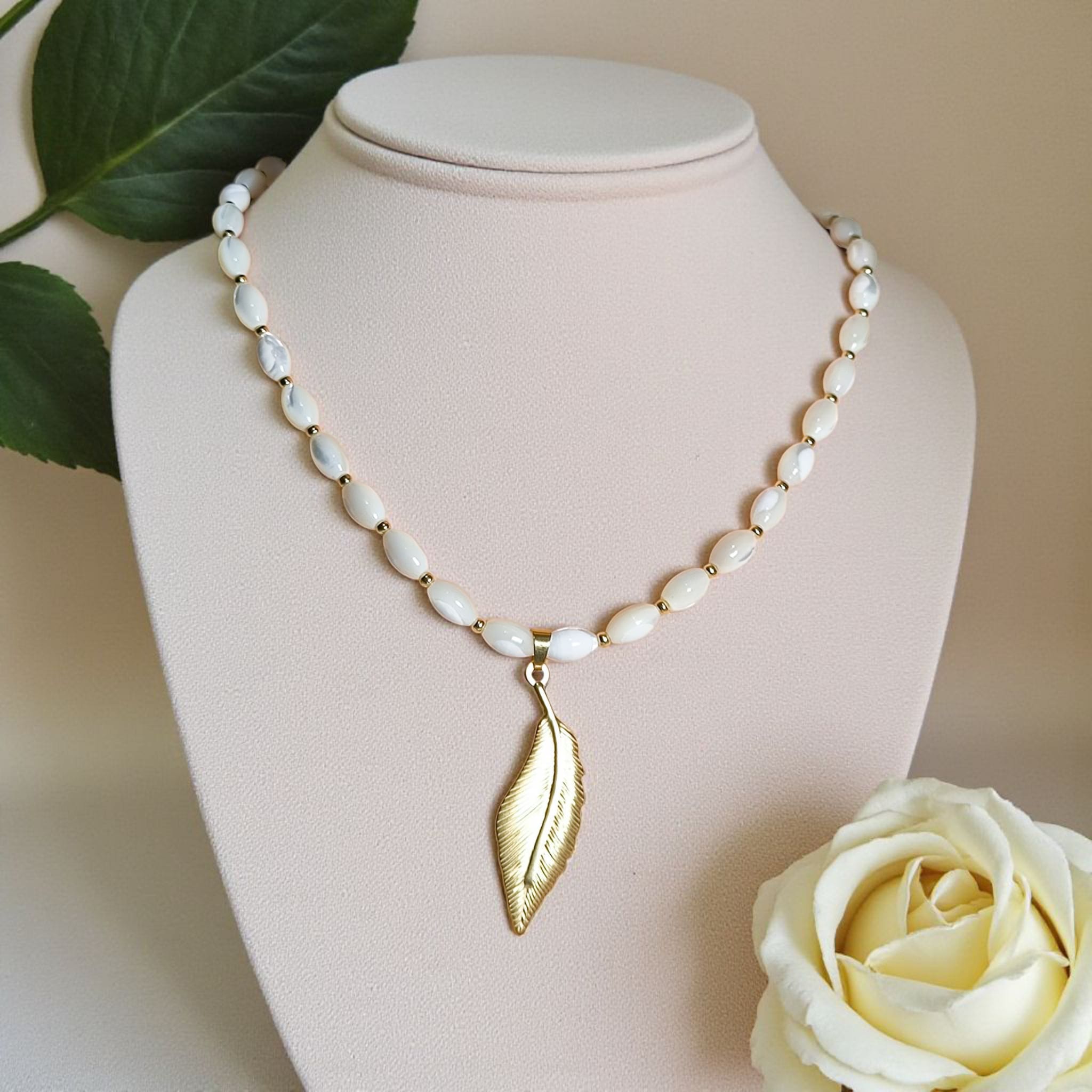 Ce collier sublime allie la douceur de la nacre blanche naturelle à l’éclat du doré inoxydable, pour un rendu lumineux et raffiné.